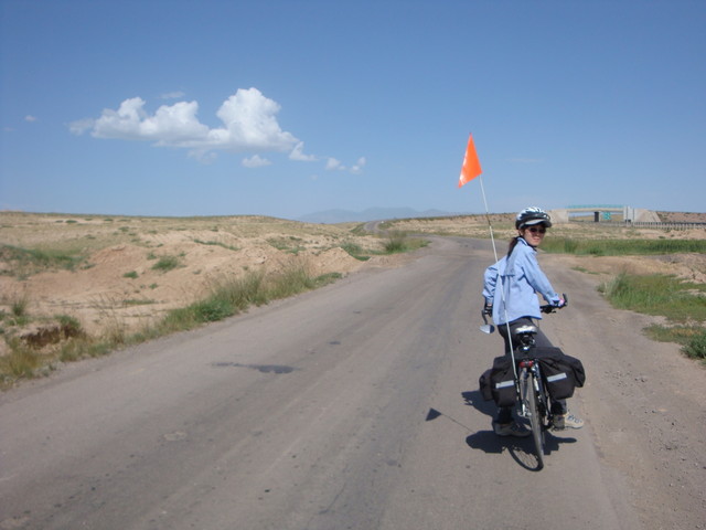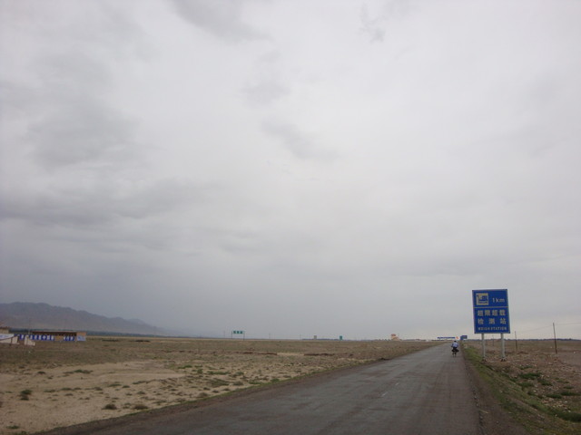 一出城就看見地平線上漫著塵土,空氣不好(因為水泥廠的緣故?)。還有人煙,看得見綠樹及人影。再往前走,就進入了荒涼的黃土地。但仍可看見草坡。而道路兩旁也常有行道樹點綴。不由得說從山丹一直到張掖的路況都很好,猶如一條黑色高速路在黃土地上展開,這還只是普通的國道312而已呢!過收費站,沒事,直走就行。(312國道也是有收費站,但不是高速路的收費站)